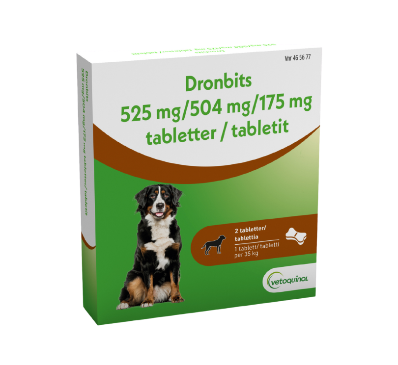 Dronbits 150 mg/144 mg/50 mg tabletter, Dronbits 525 mg/504 mg/175 mg tabletter (febantel/pyrantelembonat/prazikvantel). Receptfri. Farmakoterapeutisk grupp: Medel vid maskinfektion (QP52AA51). Indikationer: För behandling av blandinfektioner med följande arter av rundmaskar och bandmaskar. Spolmask (T.canis, T.leonina), hakmask (U.stenocephala, A.caninum), piskmask (T.vulpis). Bandmask (E.multilocularis, E.granulosus, D.caninum, T.spp., M. multiceps). Biverkningar: I mycket sällsynta fall kan det uppstå lindriga och övergående mag-tarmstörningar som kräkningar och/eller diarré. I enskilda fall kan dessa symtom åtföljas av ospecifi ka symtom som slöhet, anorexi eller hyperaktivitet. Dräktighet och laktation: Använd inte detta läkemedel på dräktiga hundar under 1:a och 2:a tredjedelen av dräktigheten. Dosering: Dronbits 150 mg/144 mg/50mg: 1 tablett/10 kg: kroppsvikt som engångsdos. Dronbits 525 mg/504 mg/175 mg: 1 tablett/35 kg kroppsvikt som engångsdos. Veterinär bör rådfrågas om behov av, och med vilket intervall upprepade behandlingar kan behövas. Datum för översyn av produktresumén: 2020-12-17.