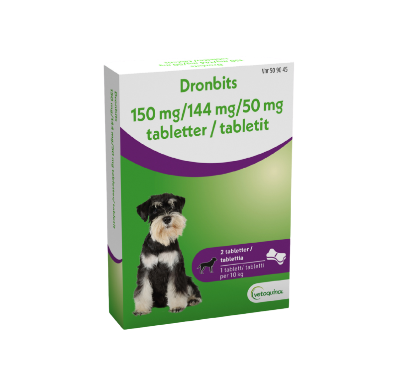 Dronbits 150 mg/144 mg/50 mg tabletter, Dronbits 525 mg/504 mg/175 mg tabletter (febantel/pyrantelembonat/prazikvantel). Receptfri. Farmakoterapeutisk grupp: Medel vid maskinfektion (QP52AA51). Indikationer: För behandling av blandinfektioner med följande arter av rundmaskar och bandmaskar. Spolmask (T.canis, T.leonina), hakmask (U.stenocephala, A.caninum), piskmask (T.vulpis). Bandmask (E.multilocularis, E.granulosus, D.caninum, T.spp., M. multiceps). Biverkningar: I mycket sällsynta fall kan det uppstå lindriga och övergående mag-tarmstörningar som kräkningar och/eller diarré. I enskilda fall kan dessa symtom åtföljas av ospecifi ka symtom som slöhet, anorexi eller hyperaktivitet. Dräktighet och laktation: Använd inte detta läkemedel på dräktiga hundar under 1:a och 2:a tredjedelen av dräktigheten. Dosering: Dronbits 150 mg/144 mg/50mg: 1 tablett/10 kg: kroppsvikt som engångsdos. Dronbits 525 mg/504 mg/175 mg: 1 tablett/35 kg kroppsvikt som engångsdos. Veterinär bör rådfrågas om behov av, och med vilket intervall upprepade behandlingar kan behövas. Datum för översyn av produktresumén: 2020-12-17.
